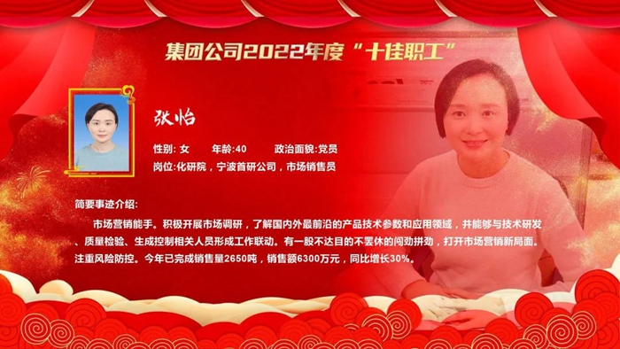 为激励苦干实干、树立身边典型、打造先进品牌,不断强化广大职工“企业发展、我有责任,拼搏‘3+1’、我在行动”主人翁意识,促进企业高质量发展,经企业推荐、广泛遴选、优中选优、民主集中、会议研究,北京化工集团决定,授予北京市化学工业研究院有限责任公司宁波首研公司市场销售员张怡(女)等10名同志北京化工集团2022年度“十佳职工”,并在北京化工集团二届一次职代会暨2023年度工作会上予以表彰。