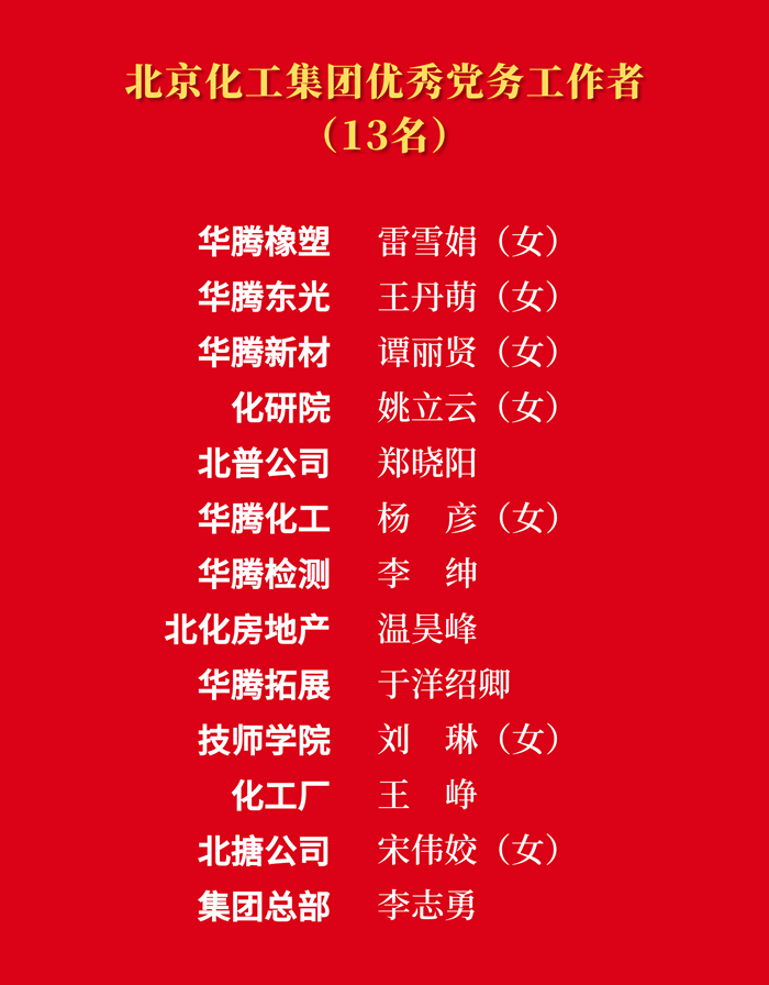 为热烈庆祝中国共产党成立103周年,大力表彰在推进“十四五”规划、推动集团“231”战略布局、完成重点工作任务等各方面涌现出来的先进集体和先进个人,市国资委党委决定,授予北搪党委“先进基层党组织”称号,授予技师学院姜洪强“优秀共产党员”称号,授予北京化工集团总部李志勇“优秀党务工作者”称号;北京化工集团党委决定,授予14个党支部“先进基层党支部”称号,授予29名同志“优秀共产党员”称号,授予13名同志“优秀党务工作者”称号。
