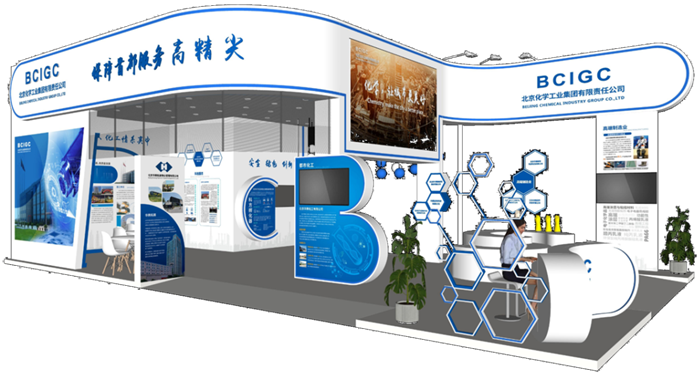 北京化工集团所设展台突出“化学让未来更美好”理念,将所属企业进行集中整合,实现集约化参展。展台通过华腾橡塑公司的橡塑手套加上炫彩效果,融入化学工业试管造型(顶部结构)、原子造型(造型伸缩灯球,现场展示不同造型)、分子结构(苯环造型)等化学元素,柔和加入声光效果,提升展台氛围效果,以弧形结构为纽带,敞开怀抱,拥抱大众,让化学走入人们的生活,以开放形态创造美好生活!